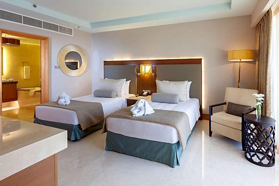 The 64 sqm Executive Suite comes complete with a range of modern luxuries and beautiful furnishings throughout - all to make your stay as enjoyable as possible. Entertaining is easy, with a separate living room and guest toilet. plus a balcony overlooking the blue waters of the Gulf of Oman.